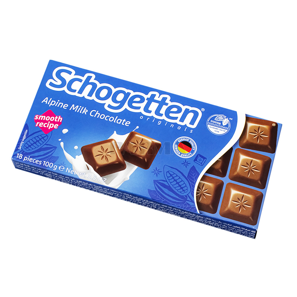 Milk chocolate. Ingredients: sugar, cacao oil, skimmed milk, cacao, lactose, cream powder, emulsifier - soy lecithin, natural aromatizers. Proteins g/100g - 5.9. Kilocalories 100g - 531. Fat 100g - 31. Carbohydrates 100g - 57.