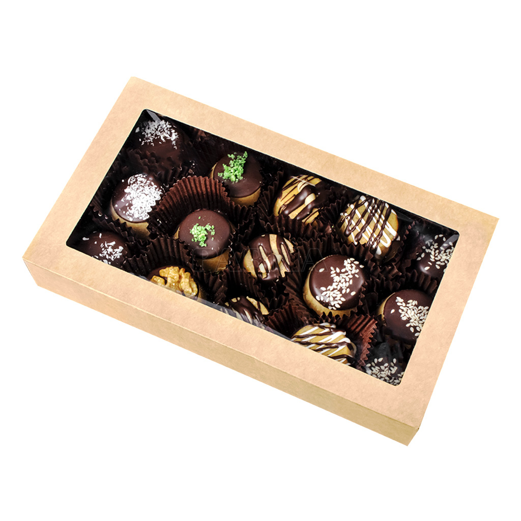 Ingredients: flour, melted vegetable oil, sugar, chocolate, cocoa butter, nuts, coconut flakes, sesame, peanuts, vanilla.