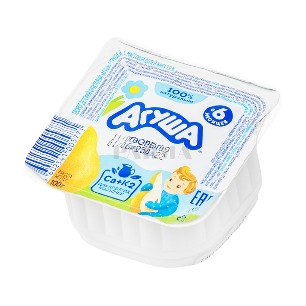 Curd for children with pear taste, fat: 3.9%. Proteins g/100g -7.4. kgcalories 100g-106. Fat 100g-3.9. Carbohydrates 100g-10.2.